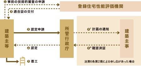 長期優良住宅を建てるためには、所定の手続きが必要となります。下図のように、建築主等は所管行政庁に必要書類とともに認定申請を行うこととなりますが、この際に申請者は、長期優良住宅建築等計画に係る技術的審査を、あらかじめ登録住宅性能評価機関に依頼することが可能な場合があります。登録住宅性能評価機関から「適合証」の交付を受けられた場合には、それもあわせて所管行政庁に提出することになります。こうして所管行政庁から「長期優良住宅」の認定が行われることとなります(住宅の着工は認定手続きの後となります)。詳しくはSE構法の登録施工店までお問合せください。
